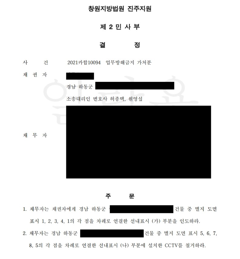 그럼에도 무단 점유와 CCTV 설치로 펜션 관리·영업이 방해되고 있으니, 인도·철거 및 업무방해금지를 구했습니다.
