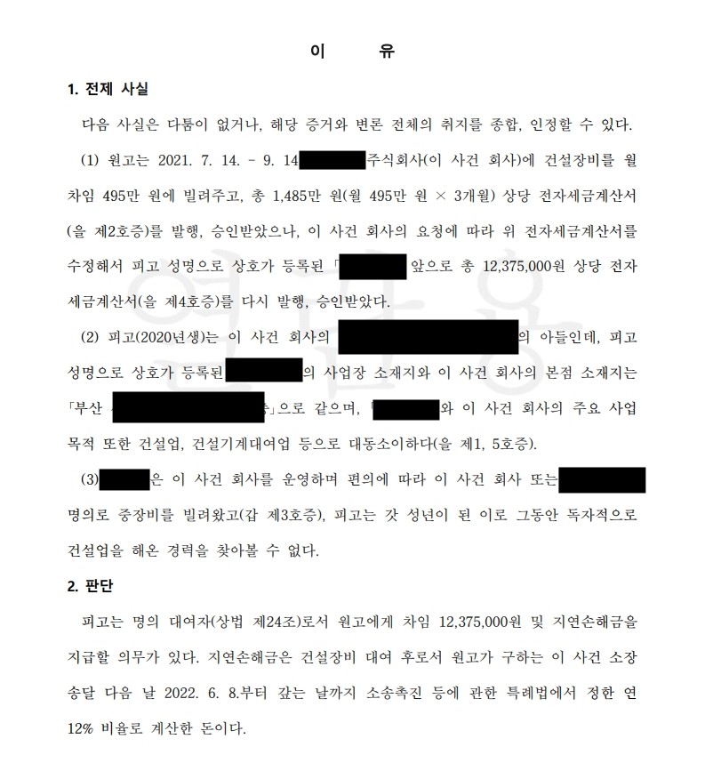 이후 임대료가 지급되지 않자, 임대인은 장비를 실제로 사용한 측과 관련된 개인 명의 사업자를 상대로 임대료 청구 소송을 제기했습니다.