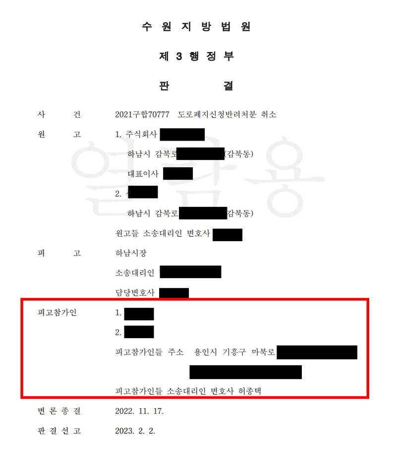 도로 소유자는 “나는 도로 소유자고, 옆집은 그냥 이용자일 뿐이라 이해관계인이 아니다”라고 주장한 반면,